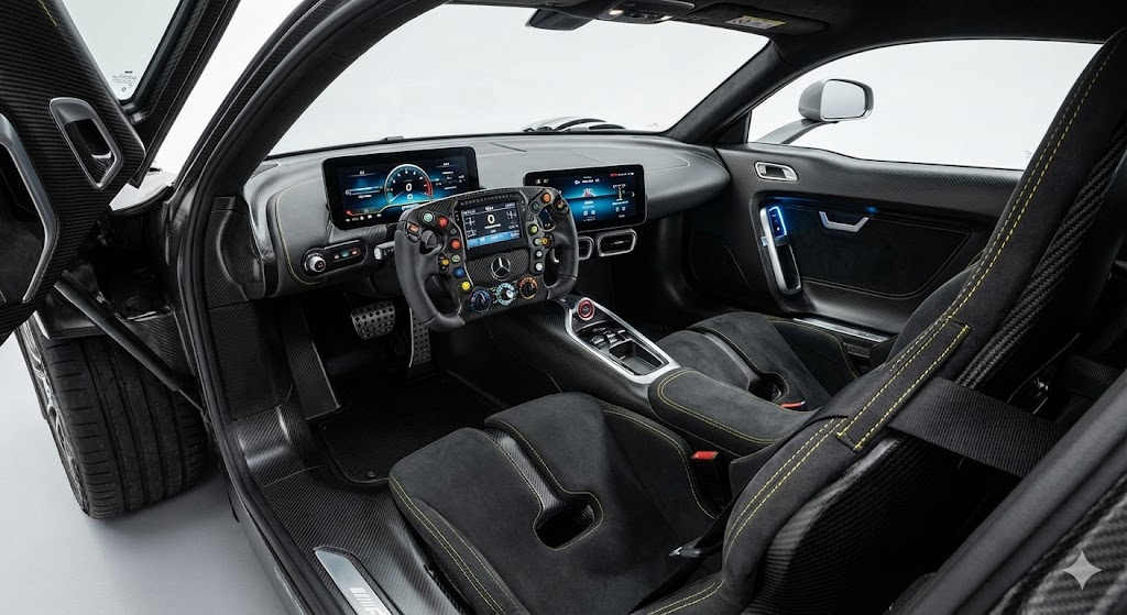 Masuk ke kabin, nuansa balap langsung terasa kuat. Interior AMG ONE mengusung konsep minimalis, ringan, dan fokus ke pengemudi: