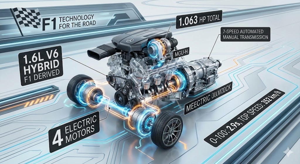 - Mesin: 1.6L V6 Turbo Hybrid (turunan langsung dari mesin F1 Mercedes)