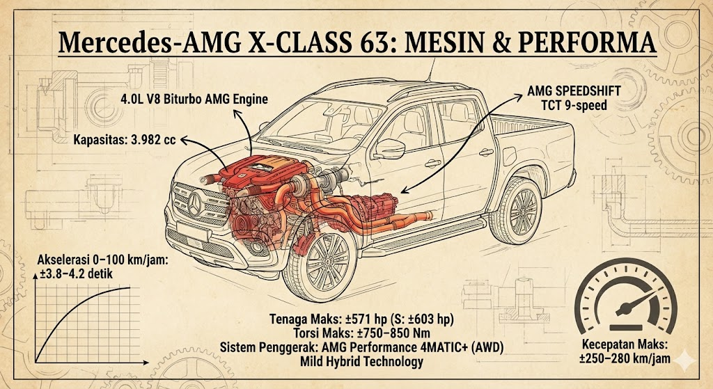 Mercedes-AMG X63 mengandalkan mesin V8 khas AMG yang terkenal dengan tenaga besar dan suara khas yang agresif.