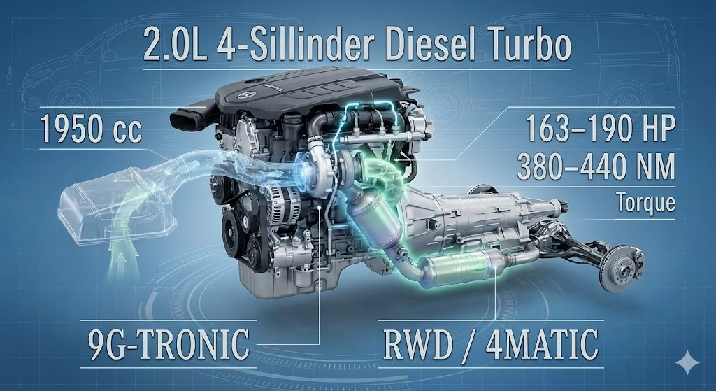 Mercedes-Benz V-Class AMG menggunakan mesin diesel yang efisien namun tetap bertenaga, cocok untuk kebutuhan mobil keluarga dan bisnis.